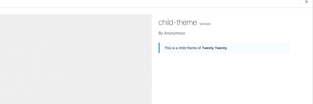 /* Template: twentytwenty*/WordPress will derive the theme name from the folder name (so child-theme in my case) and fall-back on defaults for all the other fields.