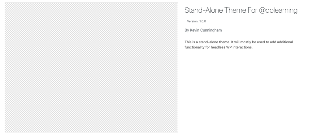 /* Theme Name: Stand-Alone Theme For @dolearning description: This is a stand-alone theme. It will mostly be used to add additional functionality for headless WP interactions. Author: Kevin Cunningham Version: 1.0.0*/will result in this: