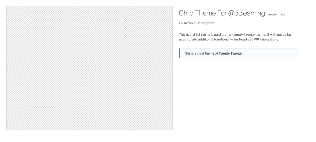 /* Theme Name: Child Theme For @dolearning description: This is a child theme based on the twenty-twenty theme. It will mostly be used to add additional functionality for headless WP interactions. Author: Kevin Cunningham Template: twentytwenty Version: 1.0.0*/will result in this: